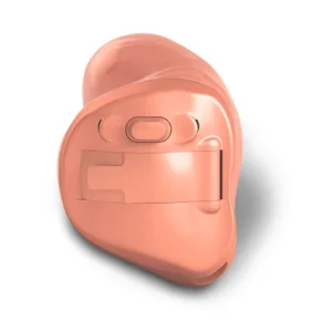 Aparelho auditivo do tipo “Completely-in-Canal” (CIC), projetado para se ajustar profundamente no canal auditivo.
